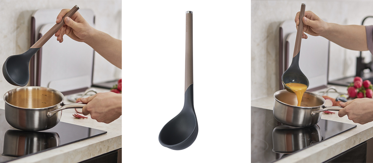 Одним из важнейших критериев при выборе кухонных инструментов является их удобство в использовании. Например, половник коллекции SmartChef сконструирован с особым вниманием к деталям: чаша с оптимальным объемом 140 мл и изогнутый ободок позволяют легко зачерпывать и наливать жидкие ингредиенты, не проливая их мимо. Угол наклона чаши в 45 градусов защищает от ожогов горячим паром, а удлиненная ручка с мягким покрытием гарантирует надежный захват.